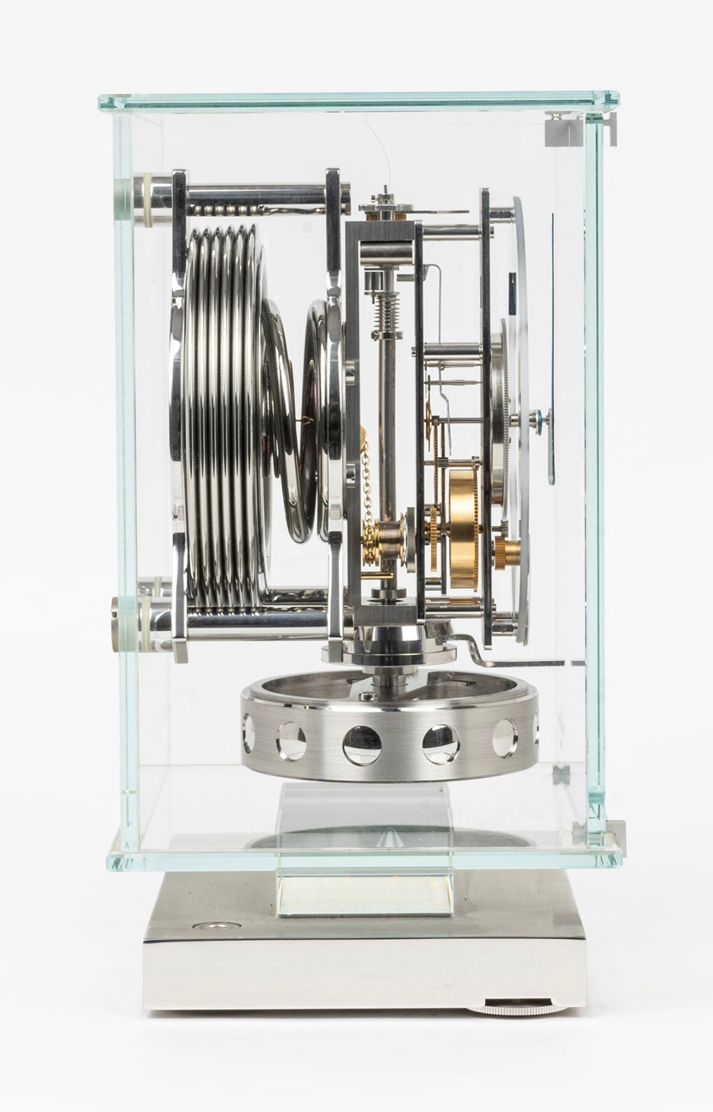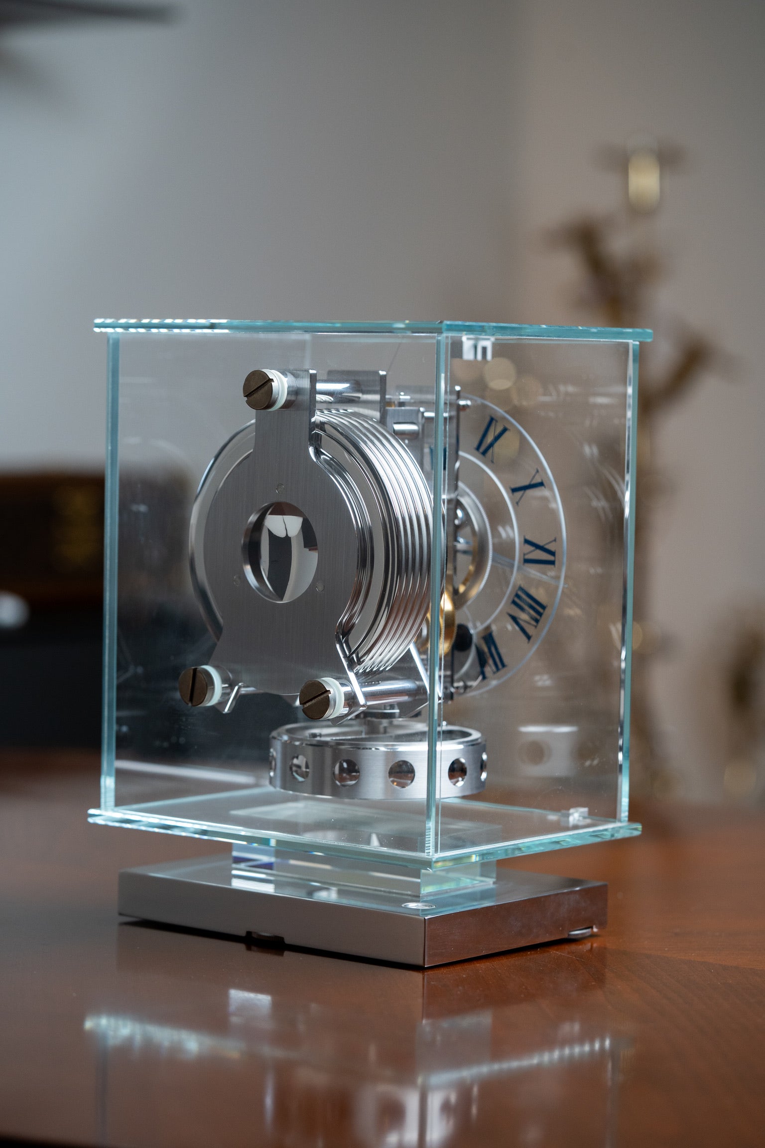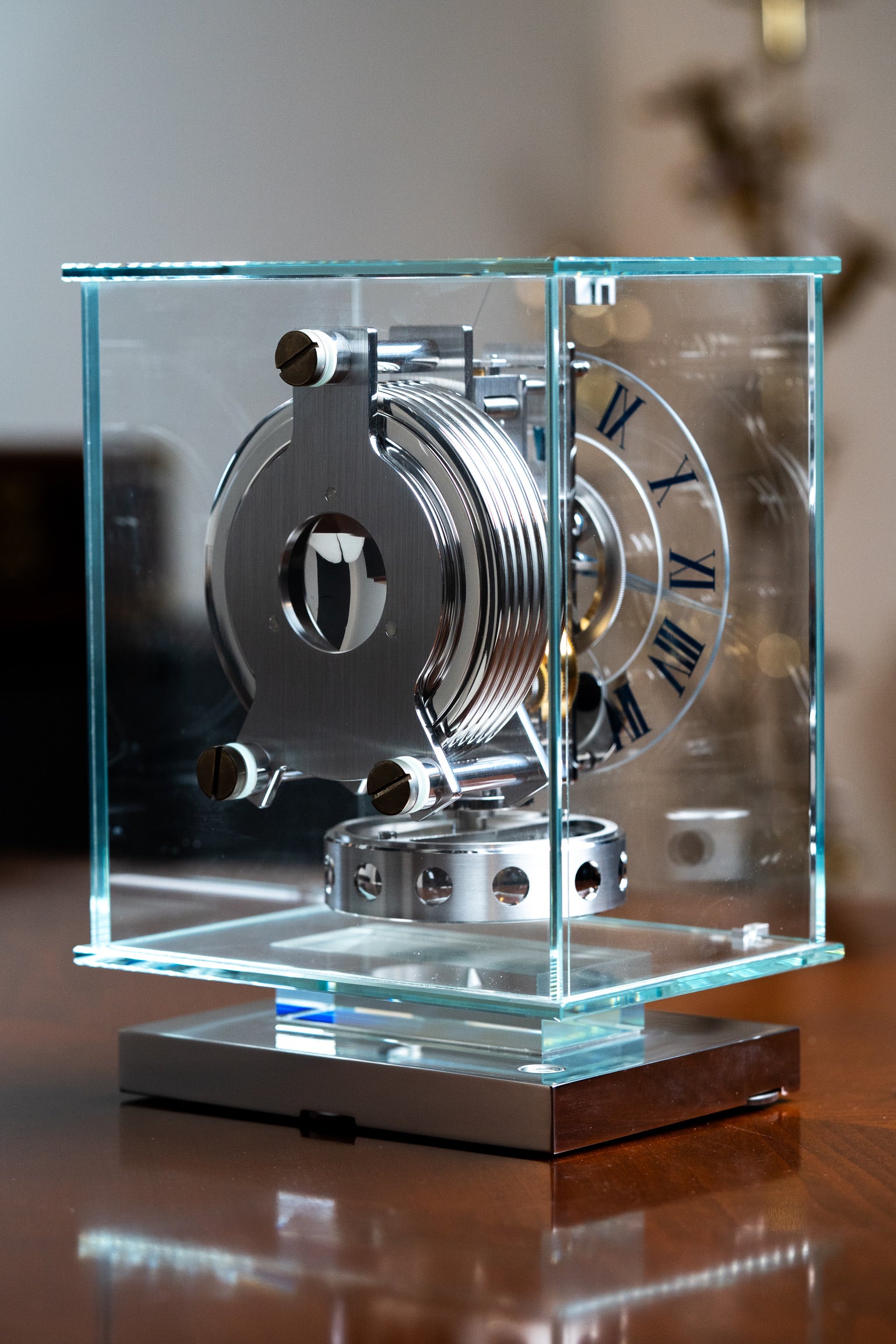 Jaeger-LeCoultre Transparent ATMOS Classic Moon Phases Clock, case with 6 glass sides on chrome metal base, signed. Full set and full serviced!