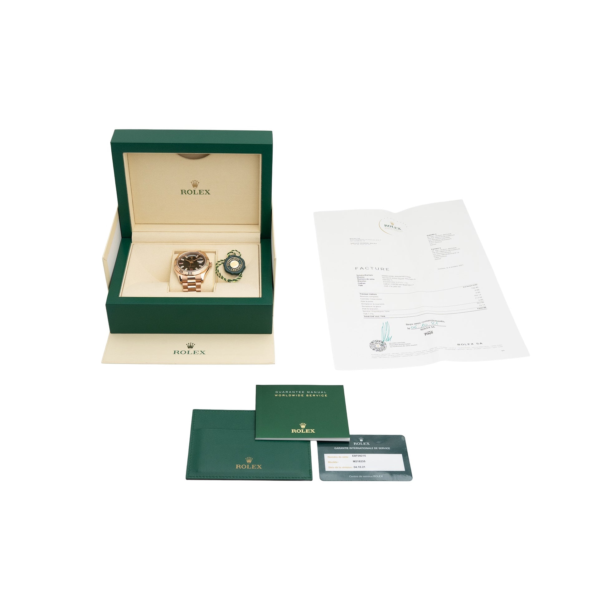 Zubehör: Boîte Rolex d'origine, Carte de garantie internationale Rolex, porte-carte vert, étiquette volante